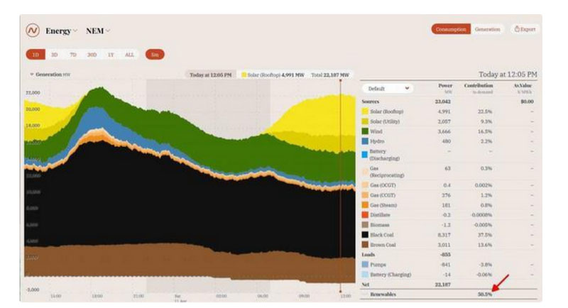 在上周西方復(fù)活節(jié)當天,澳大利亞可再生能源達到了電網(wǎng)需求的創(chuàng)紀錄水平,當時屋頂太陽能,大規(guī)模風能以及太陽能和水力發(fā)電的總產(chǎn)量達到凈負荷的50.4%。