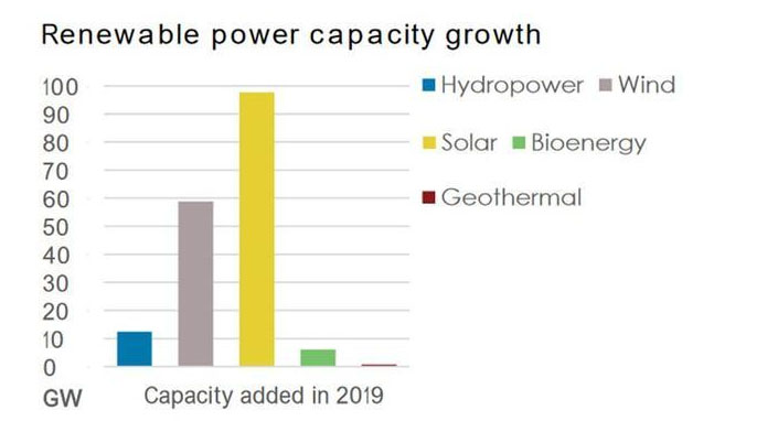 根據(jù)國際可再生能源機構(gòu)IRENA透露,2019年全球新增可再生能源裝機容量176吉瓦,其中90%來自太陽能和風(fēng)能發(fā)電。