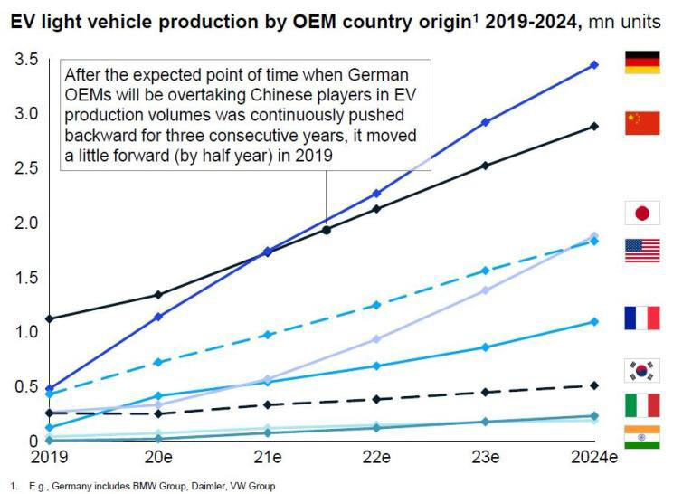 報告指出,到2024年,德國車企在全球電動車產(chǎn)量的占比將從2019年的18%增至29%。公開數(shù)據(jù)顯示,2019年中國新能源汽車產(chǎn)量為124.2萬輛,同期德國新能源汽車產(chǎn)量約為50萬輛。單看產(chǎn)量數(shù)據(jù)目前德國與中國差距較大,但從銷量增長速率方面來看,德國市場的新能源汽車需求越來越旺盛。2019年德國新能源汽車銷量同比增長50%,相比之下,中國新能源汽車銷量同比下降3.98%。從市場需求刺激生產(chǎn)的角度出發(fā),麥肯錫預(yù)測最快2021年,德國就將以170萬輛的電動車產(chǎn)量規(guī)模超越中國。