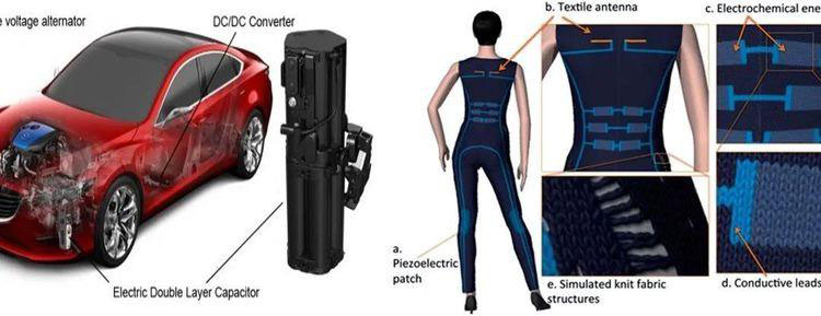 未來超級電容應(yīng)用想象圖, 包括在新能源車輛上配合電池使用,收集車輛行駛中產(chǎn)生的動能,或者無縫嵌入服裝 | https://gnanomat.com