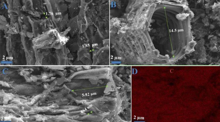 電子顯微鏡下,榴蓮碳?xì)饽z殘料內(nèi)部豐富的孔道 | www.elsevier.com/locate/est