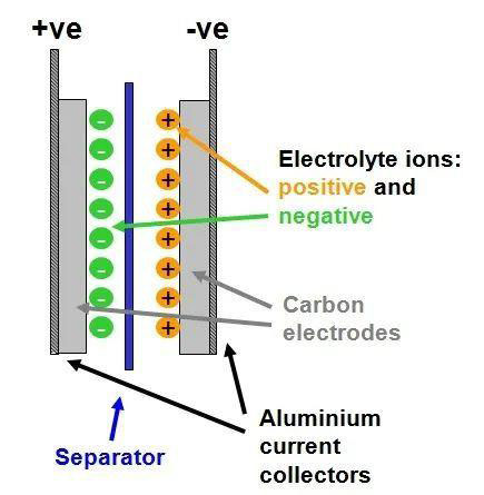 超級電容內(nèi)部結(jié)構(gòu)圖,通過內(nèi)部碳材料吸附正負(fù)電荷來實(shí)現(xiàn)儲能 | https://electricalfundablog.com/