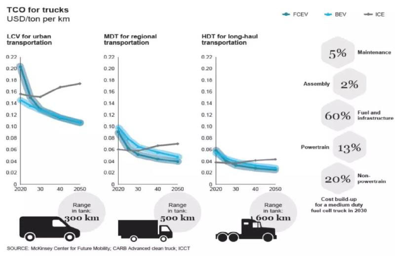 結合可再生氫源,全生命周期零排放是可以做到的。燃料電池卡車在行駛相同距離時消耗的能源比內燃機卡車要少,這將極大地減輕運輸的能源負擔。此外,卡車經常以車隊的形式運行,這使得基礎設施建設有利可圖,因為其高使用率,并將降低燃料的成本??ㄜ噾靡彩芤嬗谙蚱渌\輸應用轉讓技術,例如在海運或鐵路部門使用同樣的燃料電池或儲氫罐,從而增加了規(guī)模并減少了關鍵部件的成本。
