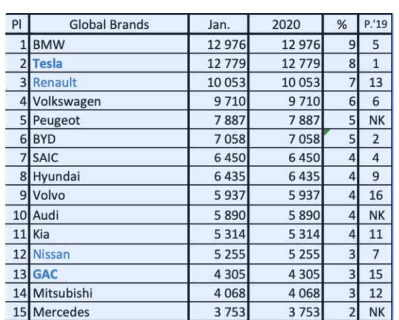 在全球車企排名中,這樣的領(lǐng)先也同樣十分明顯。1月,電動汽車銷量前十位的車企中,有6個來自歐洲,而在排名前五的品牌中,除了特斯拉之外,其余全部為歐洲車企。其中,寶馬以插電式混合動力產(chǎn)品受到市場熱捧,最終以12976輛的成績,奪下冠軍。而特斯拉則以197輛的差距跌至第二位。