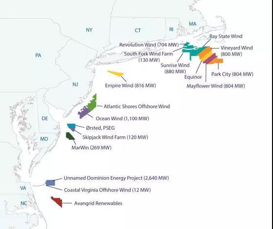 陸上風(fēng)電的蓬勃發(fā)展也延伸到了海上,2019年,東海岸沿線有六個州宣布了共計16300 MW的海上風(fēng)電建設(shè)目標(biāo)。這比之前承諾過的海上風(fēng)電建設(shè)目標(biāo)翻了一番還多,現(xiàn)在已超25000MW。新澤西州州長Phil Murphy宣布將于2035年之前將花園州的海上風(fēng)電發(fā)展目標(biāo)擴大到7500MW。
