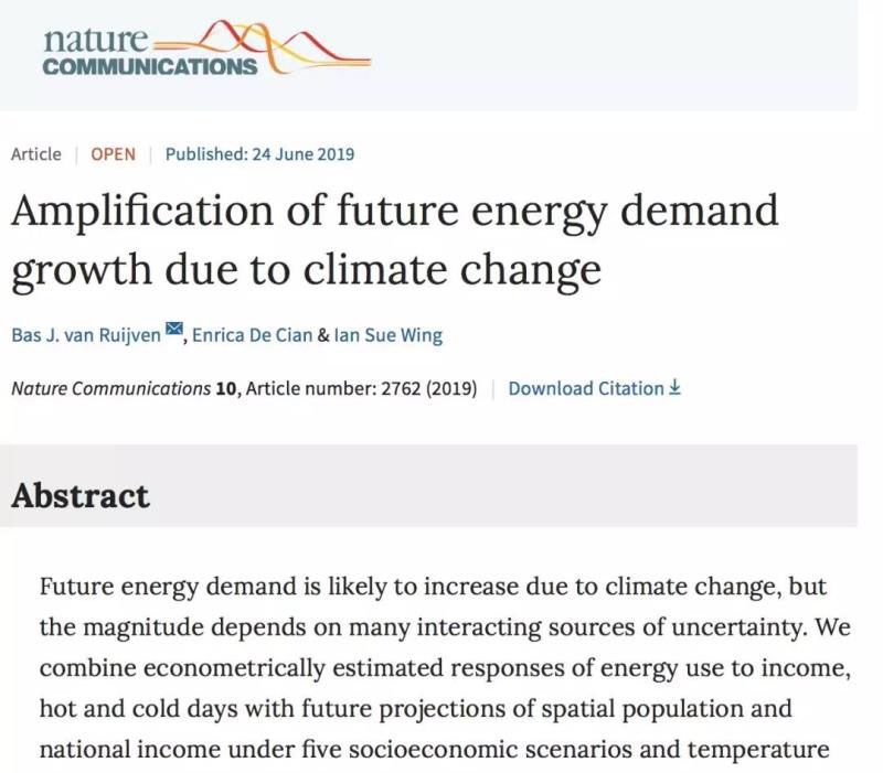 國際應(yīng)用系統(tǒng)分析研究所(International Institute for Applied Systems Analysis,簡稱IIASA)學(xué)者在《自然·通訊》雜志發(fā)表文章,認為全球未來的能源需求可能會因氣候變化而增加,但其幅度取決于許多相互作用的不確定性因素。該研究使用計量經(jīng)濟的方法評估能源需求與人均收入、冷熱天數(shù)的響應(yīng),考慮2050年左右的平均氣溫的上升,推算出全球變暖使得全球能源需求在2050年左右增加了25-58%(在較溫和的溫升情況下也會增加11-27%),而能源需求由于社會經(jīng)濟、人口發(fā)展本身到2050年也將增長1.7-2.8倍。在美國,歐洲和中國的熱帶和南部地區(qū)的能源需求將因為氣候變暖增長超過25%。