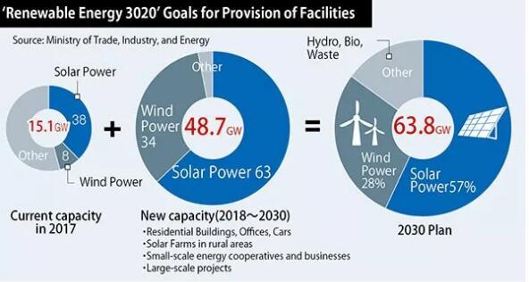 中國儲能網(wǎng)訊:“可再生能源3020實施計劃”是韓國政府為實現(xiàn)能源轉(zhuǎn)型于在2017年末提出的。其目標是到2030年,可再生能源占總能源消耗比例達到20%。為實現(xiàn)這一目標,在此期間需要增加4870萬的可再生能源裝機容量,最終達到6380萬的裝機規(guī)模,其中風電占比28%和太陽能占比57%。