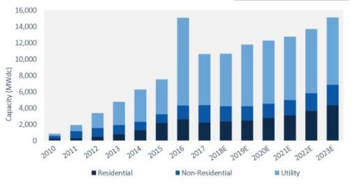 展望未來,GTM和SEIA預(yù)測美國太陽能市場將繼續(xù)保持增長,但“直到2023年才能達到我們在2016年看到的令人驚嘆的創(chuàng)紀(jì)錄水平?!?