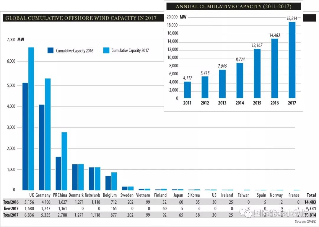 中國儲能網(wǎng)訊:根據(jù)全球風(fēng)能理事會的數(shù)據(jù),2017年全球新增海上風(fēng)電裝機4.331吉瓦,累計裝機達到18.814吉瓦,比2016年總裝機(14.483吉瓦)增長30%。其中新增海上風(fēng)電裝機最多的3個國家是:德國(+1.680吉瓦)、英國(1.247吉瓦)、中國(1.161吉瓦)。