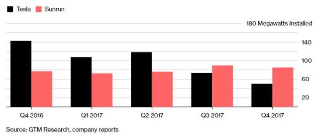 據(jù)研究公司GTMResearch估計(jì),特斯拉在去年第四季度共安裝了87兆瓦的商用和住宅太陽能,其中住宅太陽能為50兆瓦。而據(jù)周二的一份聲明顯示,競(jìng)爭(zhēng)對(duì)手Sunrun公司在同期安裝了85兆瓦的住宅太陽能系統(tǒng)。在去年第三季度,特斯拉的住宅太陽能安裝量也不及Sunrun。