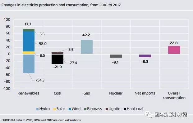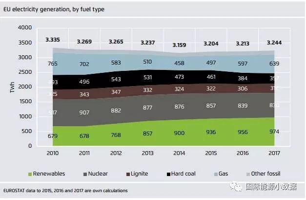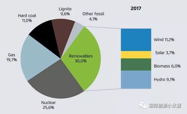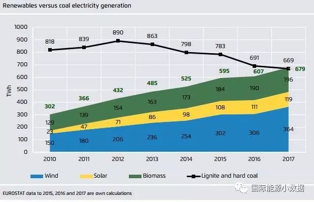 如果在可再生能源中不計(jì)水電,2017年歐盟風(fēng)電、生物質(zhì)和太陽能發(fā)電量(679TWh)在歷史上首次超過了煤電(669TWh)。