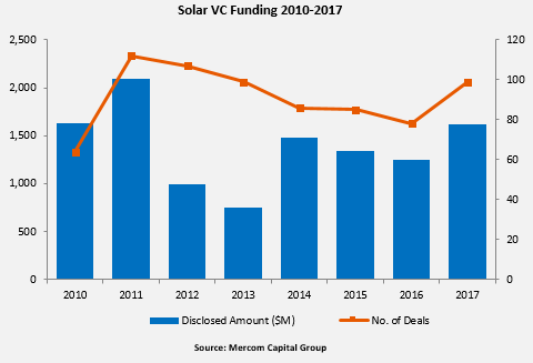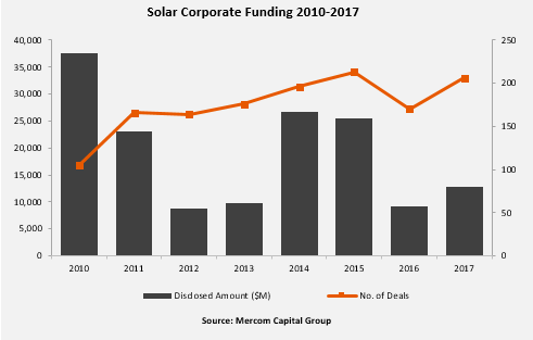 中國儲能網(wǎng)訊:全球清潔能源通訊和咨詢公司Mercom資本日前發(fā)布2017年太陽能行業(yè)融資和并購活動的年度報告稱,全球企業(yè)對太陽能行業(yè)的融資總額達到128億美元,比2016年的91億美元增長了41%,包括風(fēng)險投資/私募股權(quán)(VC),債務(wù)融資和公共市場融資。