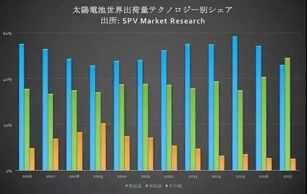 圖2 太陽能電池板類型和世界光伏發(fā)電市場類型的市場份額趨勢(2006-2017年)