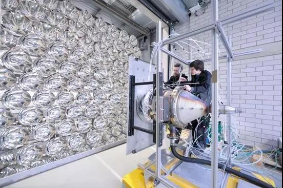 據(jù)德國國家航空航天研究中心(DLR)消息,由149盞短弧氙氣燈組成的Synlight系統(tǒng)已經(jīng)于3月23日正式啟動測試。這堵近14米高、16米寬的“燈墻”,燈光投射到20x20厘米的聚焦平面上,產(chǎn)生的輻射強度是太陽光照射同等面積的1萬倍,溫度最高可達3000攝氏度,大約是高爐溫度的2到3倍,功率達350千瓦。