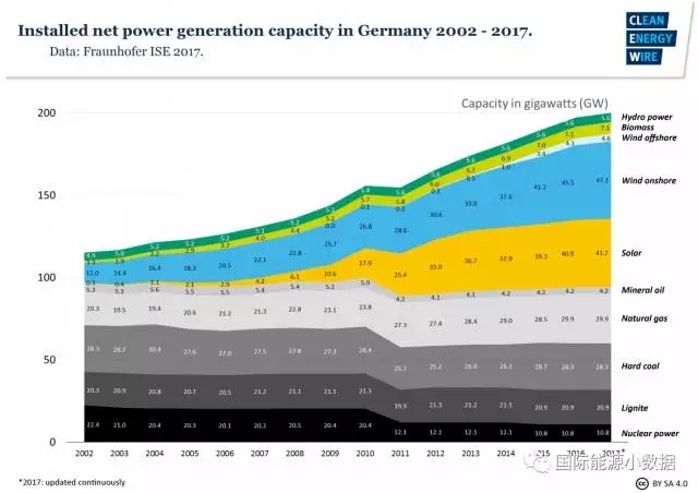 到目前為止,德國2017年發(fā)電裝機(jī)容量為200.2吉瓦,其中核電10.8吉瓦(5.4%)、褐煤20.9吉瓦(10.4%)、硬煤28.3吉瓦(14.1%)、天然氣29.9吉瓦(14.9%)、礦物油4.2吉瓦(2.1%)、太陽能41.7吉瓦(20.8%)、陸上風(fēng)電47.1吉瓦(23.5%)、海上風(fēng)電4.6吉瓦(2.3%)、生物質(zhì)7.1吉瓦(3.5%)、水電5.6吉瓦(2.8%)。綜合而言,德國的可再生能源發(fā)電裝機(jī)占總裝機(jī)容量的53.0%,而煤電裝機(jī)占24.6%。