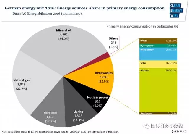 如果看一次能源消費(fèi)(包括交通、供暖需求),那么2016年煤炭占33.6%、核能6.9%、天然氣22.7%、礦物油34.0%、可再生能源12.6%,其他1.8%。