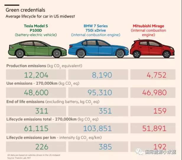 如果與豪華的寶馬7系列(BMW 7 Series)燃油汽車的碳排放(385克/公里)相比,特斯拉Model S的碳排放確實要低41%。但是,如果與小巧的三菱Mirage燃油汽車的碳排放(192克/公里),那么特斯拉Model S全生命周期的平均碳排放就要高出17%。