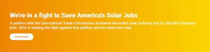 圖片內(nèi)容:為了挽救美國太陽能行業(yè),我們正在奮斗。這份提請(qǐng)威脅到美國太陽能行業(yè)26萬個(gè)工作機(jī)會(huì),太陽能行業(yè)協(xié)會(huì)正奮力反對(duì),我們需要你的幫助。