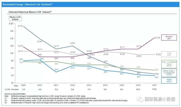 中國儲能網(wǎng)訊:美國LAZARD公司日前發(fā)布一年一度的美國各類發(fā)電技術平準成本(Lazard Levelized Cost of Energy Version 11.0)數(shù)據(jù)。
