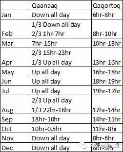 格陵蘭目前僅有一個(gè)南部城市的太陽(yáng)能電站試點(diǎn)項(xiàng)目。北部城市雖然全年有三個(gè)半月極夜,但也有4個(gè)月是極晝。以下選取了北部城市Qaanaaq和南部城市Qaqortoq,統(tǒng)計(jì)了2017年每月的日照時(shí)長(zhǎng),供參考。