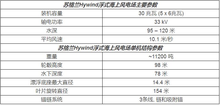 該風電場由5臺各6MW的風機組成,總?cè)萘繛?0MW,每座浮塔重達11200噸。風電場海域水深95-120米,離岸25公里。其他參數(shù)如下: