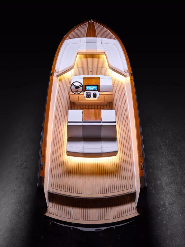 Dasher作為世界首款全電動豪華游艇,在艇身材質(zhì)上有諸多講究。它采用了一種叫做過碳環(huán)氧樹脂的復(fù)合材料,外表看起來像柚木,可以顯著減輕船體重量。此外,3D打印技術(shù)該的另一大創(chuàng)新,這項技術(shù)被用來制作船內(nèi)的一些桿件和控制臺等部件。駕駛位的伸縮式屏幕和LED觸摸屏,便于導(dǎo)航,看起來極具科技感。