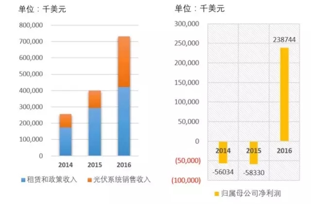 據(jù)SolarCity公布財(cái)報(bào)數(shù)據(jù),2016年公司實(shí)現(xiàn)營(yíng)業(yè)收入7.30億美元,同比增長(zhǎng)82.76%。其中來(lái)自光伏系統(tǒng)租賃和政策收入占總收入比重過(guò)半,為4.22億美元,同比增長(zhǎng)43.87%;來(lái)自光伏系統(tǒng)和組件的銷(xiāo)售收入為3.08億美元,較2015年將近翻了一番。