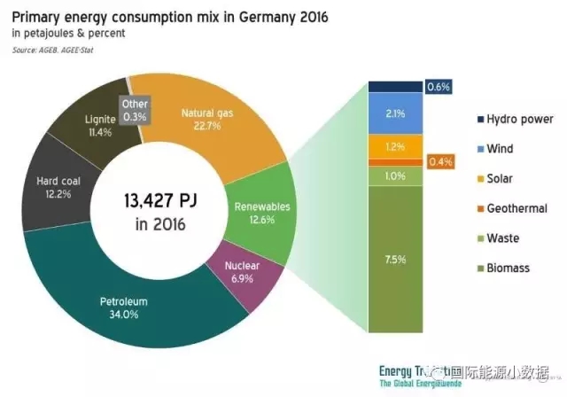 如果從一次能源消費的角度來看,2016年德國的石油消費占34%、煤炭占23.6%、天然氣占22.7%、核能占6.9%,各類可再生能源及其它占12.9%(生物質(zhì)7.5%、風電2.1%、太陽能1.2%、垃圾1.0%、水電0.6%、地熱0.4%)??傮w而言,化石能源仍占德國一次能源消費的80.3%。