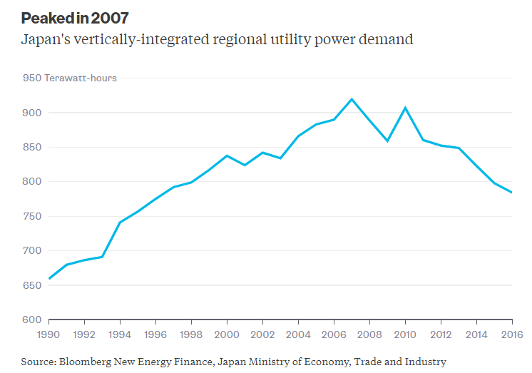 像美國和其他許多發(fā)達國家一樣,日本十大電力公司服務的電力需求在十年前達到了頂峰。目前日本的電力需求相比2007年減少了15%。