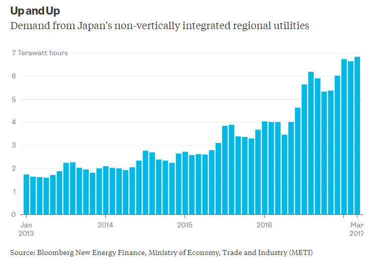 2016年4月,日本向所有用戶全面放開電力市場并引入競爭,電力市場變得更有生機。在當時,400多家解除管制的電力零售商的電力需求一下子增加了三分之二。