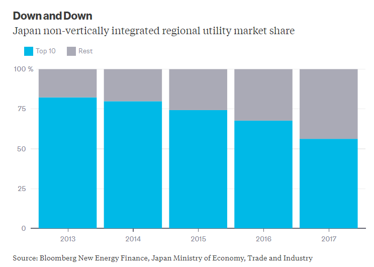 2013年,非垂直一體化電力企業(yè)的公司只能向大用戶銷售電力時,日本十大電力公司占據(jù)80%以上的零售市場份額。截至2017年3月,十大電力公司只擁有55%的市場份額。
