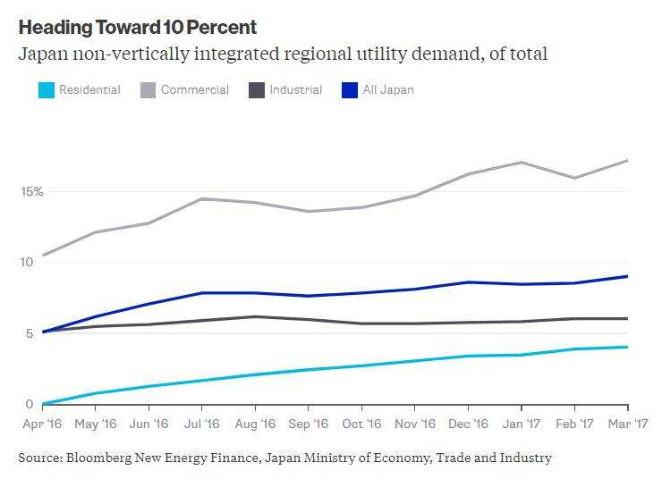 截至2017年4月,非垂直一體化區(qū)域電力企業(yè)的零售商已經(jīng)可以滿足超過10%的商業(yè)電力需求。從2016年完全放開市場競爭開始,這些電力零售商滿足的工業(yè)用電需求幾乎沒有變化,但是零售用電需求份額從零增長到了4%。現(xiàn)在,日本近10%的用電量由供電企業(yè)以外的公司提供。