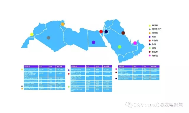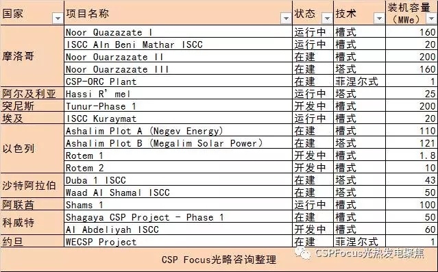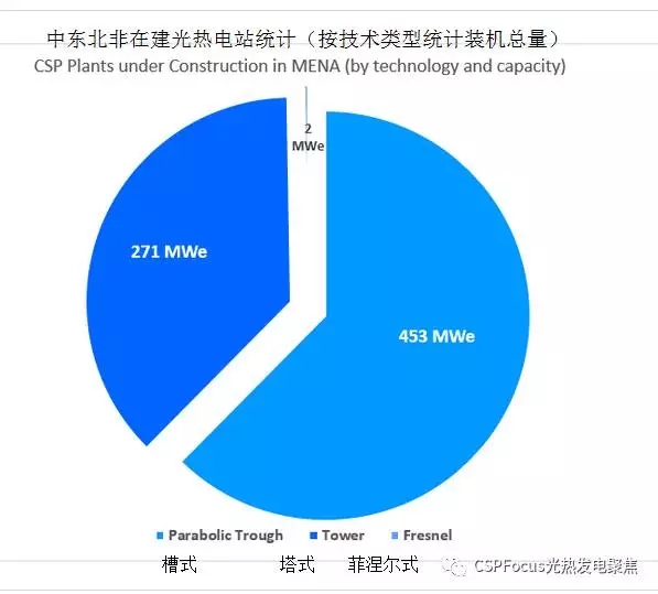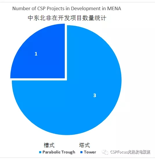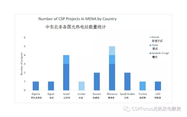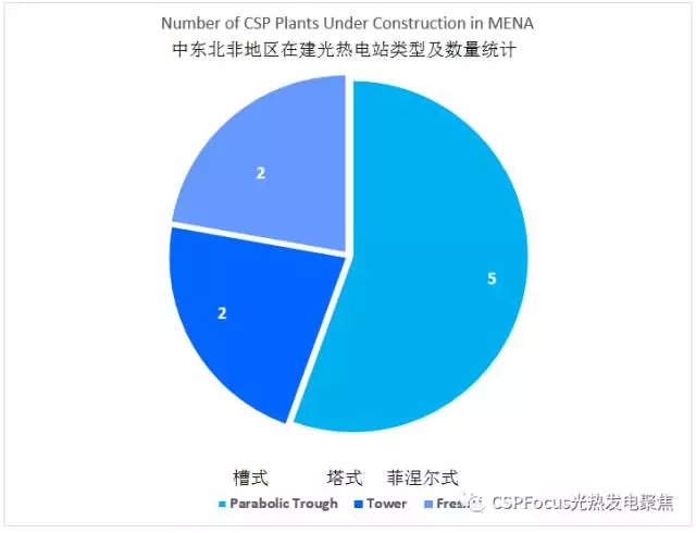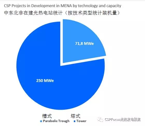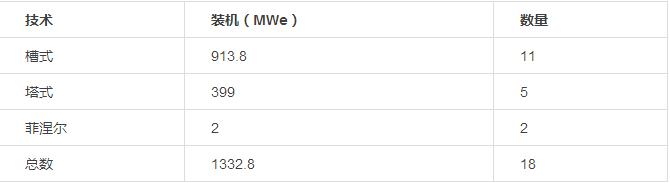 目前MENA地區(qū)擁有光熱項目總數(shù)為18個,合計裝機量為1332.8 MWe。從技術(shù)類型上來看,槽式占大部分,菲涅爾式為試驗性小型電站。