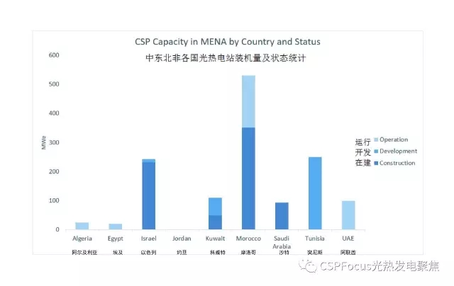 中國儲能網(wǎng)訊:作為全球光熱發(fā)電重要市場之一,中東北非(MENA)地區(qū)多個國家均積極參與到光熱電站的開發(fā)和建設(shè)當中。這些國家包括摩洛哥、阿聯(lián)酋、沙特、突尼斯、以色列、科威特、阿爾及利亞、埃及、約旦九國。其中摩洛哥已建成項目兩個、在建項目三個,共計541MW位位居總裝機量第一。