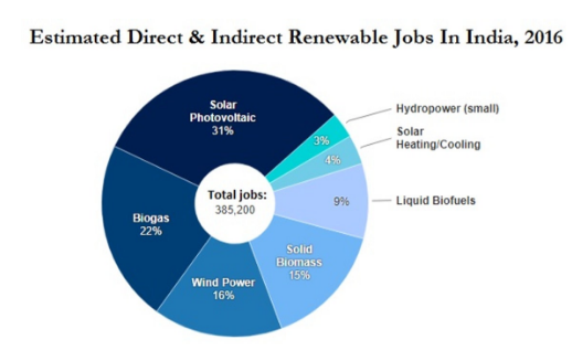 2016年,印度可再生能源裝機(jī)容量占全球總量的5%,投資總額達(dá)到97億美元,直接和間接從事可再生能源領(lǐng)域的人員達(dá)到830萬人,與中國、巴西、美國、日本和德國一樣成為全球領(lǐng)先的可再生能源就業(yè)市場。
