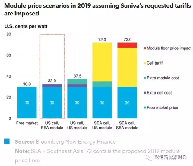 假設(shè)中國公司在美國投建的GW級光伏電池生產(chǎn)廠在2019年投產(chǎn),并將生產(chǎn)的電池運(yùn)往東南亞或墨西哥封裝成組件,則該組件相較于電池和組件都在東南亞完成的情景會產(chǎn)生大約3美分/W的額外費(fèi)用。假設(shè)這筆額外費(fèi)用直接反映在產(chǎn)品售價(jià)上,在美國的組件售價(jià)會被抬高約10%。