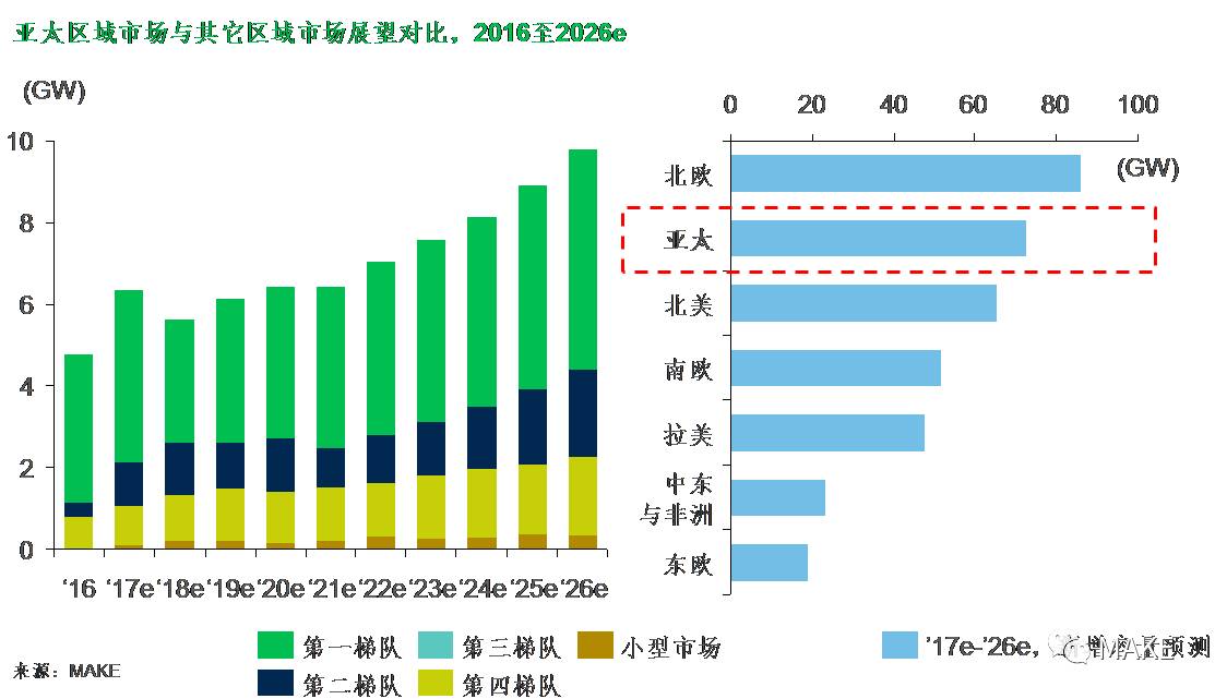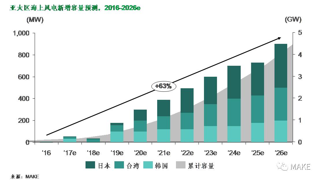 亞太海上風(fēng)電項(xiàng)目的開發(fā)經(jīng)過多年規(guī)劃及示范項(xiàng)目的建設(shè)后,將于2017年進(jìn)軍大型風(fēng)電項(xiàng)目。韓國(guó)30MW Tamra海上風(fēng)場(chǎng)將于2017年并網(wǎng),為更多海上風(fēng)電項(xiàng)目的開發(fā)建設(shè)鋪平道路,也本土企業(yè)開發(fā)大型海上項(xiàng)目提供寶貴的發(fā)展經(jīng)驗(yàn)。臺(tái)灣、日本及韓國(guó)等主要風(fēng)電市場(chǎng)為促使海上風(fēng)電的發(fā)展,也正改善各國(guó)內(nèi)的政策環(huán)境。臺(tái)灣政府計(jì)劃至2025年實(shí)現(xiàn)3GW海上風(fēng)電開發(fā)計(jì)劃。日本政府正在制定公共海域風(fēng)電開發(fā)的法律法規(guī),逐步由港口項(xiàng)目向近海項(xiàng)目轉(zhuǎn)型。韓國(guó)新政府則計(jì)劃關(guān)閉所有核電站和火電廠,擴(kuò)大可再生能源的發(fā)電量。上述舉措均是積極的發(fā)展趨勢(shì),促使2016年至2026年內(nèi)可再生能源的復(fù)合年均增長(zhǎng)率(CAGR)達(dá)到63%。