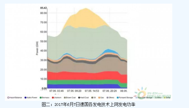 在13:30分太陽能及風力瞬時發(fā)電功率超過52GW,超過了此前的最高紀錄44GW。德國可再生能源發(fā)電功率在周三達到了63GW的新高,其中光伏發(fā)電20GW,陸上風力發(fā)電28GW,海上風力發(fā)電4.5GW,水力發(fā)電4GW,生物質發(fā)電5.5GW。剩余的電力需求則由傳統(tǒng)發(fā)電廠滿足,由于褐煤與核電發(fā)電成本較低,因此剩下的電力需求是由這兩類發(fā)電廠滿足,如圖二所示。(來源:EnergyCharts)
