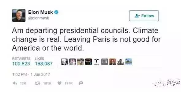 值得一提的是,就在今年6月初,美國總統(tǒng)特朗普在白宮宣布退出《巴黎協(xié)定》時,馬斯克當(dāng)即決定退出特朗普顧問團(tuán)隊,并稱“美國退出巴黎氣候協(xié)議既不利于美國、也不利于全球?!?