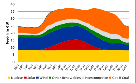 德國風(fēng)力及太陽能發(fā)電上網(wǎng)功率創(chuàng)紀(jì)錄出現(xiàn)的時間在13:30-13:45這段時間內(nèi),同一天英國可再生能源發(fā)電上網(wǎng)功率也在中午達(dá)到了歷史新高,上網(wǎng)功率高達(dá)20GW(來源:Montel)。在這一時刻英國超過50%的用電量是通過二氧化碳零排放的發(fā)電技術(shù)來滿足的。圖一展示了當(dāng)天英國各種發(fā)電技術(shù)的發(fā)電功率,其中可以看到風(fēng)力發(fā)電的上網(wǎng)功率尤其高(數(shù)據(jù)來源:英國國家電網(wǎng))。