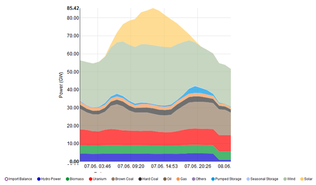 在13:30分太陽能及風(fēng)力瞬時發(fā)電功率超過52GW,超過了此前的最高紀(jì)錄44GW。德國可再生能源發(fā)電功率在周三達(dá)到了63GW的新高,其中光伏發(fā)電20GW,陸上風(fēng)力發(fā)電28GW,海上風(fēng)力發(fā)電4.5GW,水力發(fā)電4GW,生物質(zhì)發(fā)電5.5GW。剩余的電力需求則由傳統(tǒng)發(fā)電廠滿足,由于褐煤與核電發(fā)電成本較低,因此剩下的電力需求是由這兩類發(fā)電廠滿足,如圖二所示。(來源:Energy Charts)