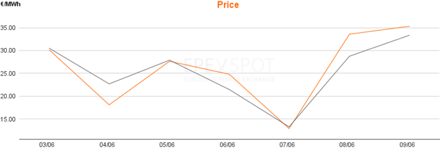 雖然可再生能源發(fā)電量增多,但是德國2017年6月7日的電價卻沒有下降至負(fù)值。這主要是因為在這段時間內(nèi)德國的用電需求也一直維持在50至80GW之間??墒怯捎诳稍偕茉窗l(fā)電成本非常低,也壓低了電力現(xiàn)貨交易市場EPEX Spot的成交價格。如圖三所示為交易所2017年6月第一周的平均交易電價(來源:EPEX Spot),由此可以很清楚的看到,2017年6月7日周三的的平均交易電價為13.31歐元/WMh,比這周其他幾天的平均交易電價低10-20歐元。