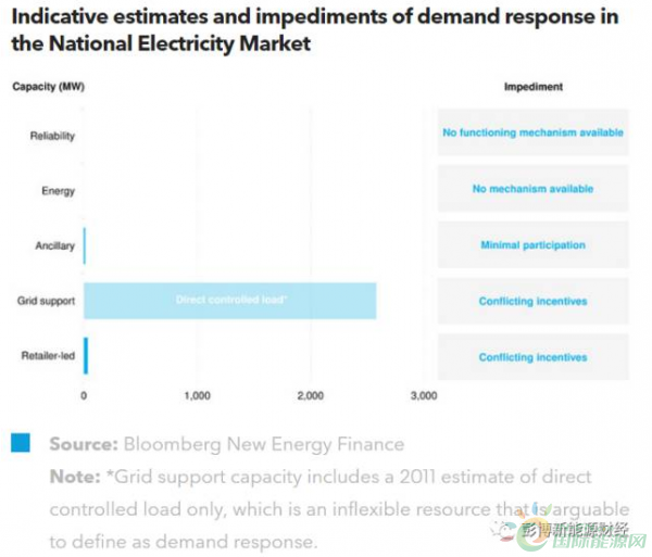 需求響應(yīng)在澳大利亞國家電力市場(chǎng)(NEM)中面臨的主要阻礙在于難以進(jìn)入電力批發(fā)市場(chǎng),而各大電廠的供電刺激措施也互相矛盾。NEM缺乏其它市場(chǎng)中需求響應(yīng)資源廣泛存在所須具備的兩大關(guān)鍵因素:容量電費(fèi)或可用性費(fèi)用以及第三方電力集成商的參與。而NEM目前只針對(duì)不可調(diào)度的需求響應(yīng)的參與提供刺激措施,但這一做法并無多大意義。