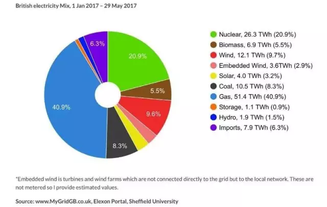 中國儲能網(wǎng)訊:根據(jù)MyGridGB的數(shù)據(jù),2017年1月1日至5月29日這5個月間英國電力供應中有51.4TWh來自天然氣發(fā)電,占總量的40.9%,其次是核電(26.3TWh,20.9%)、風電(15.7%,12.6%)、煤電(10.5TWh,8.3%)、生物質發(fā)電(6.9TWh,5.5%)、太陽能(4.0TWh,3.2%)、水電(1.9TWh,1.5%)、儲能(1.1TWh,0.9%);此外還有7.9TWh來自進口,占電力供應的6.3%。