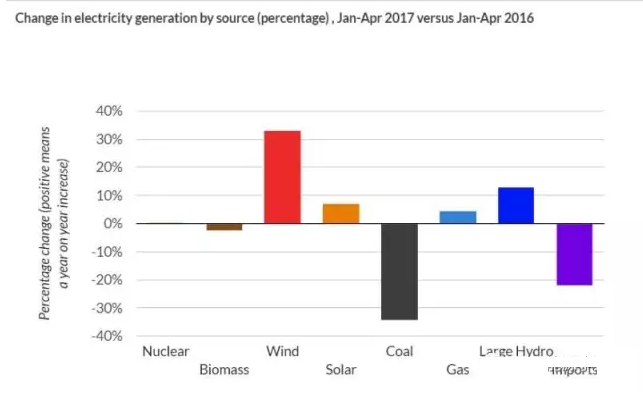 與2016年1-4月電力供應相比,核電持平;煤電下降34.5%、生物質發(fā)電下降2.6%、進口下降22.1%;風電增長33%、太陽能發(fā)電增長7.3%、水電增長13%、天然氣發(fā)電增長4.7%。