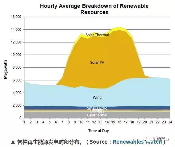 太陽(yáng)能發(fā)電主要集中在正午12點(diǎn)的前后5個(gè)小時(shí),而風(fēng)力發(fā)電、小型水力發(fā)電、沼氣發(fā)電、生物質(zhì)能以及地?zé)岚l(fā)電則相對(duì)平均分布在一天當(dāng)中。