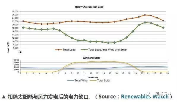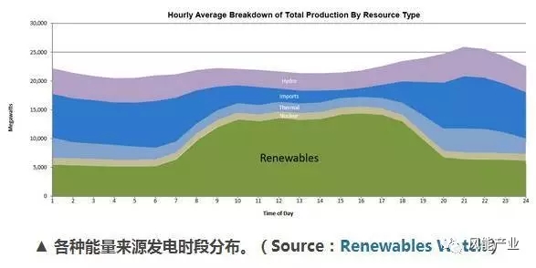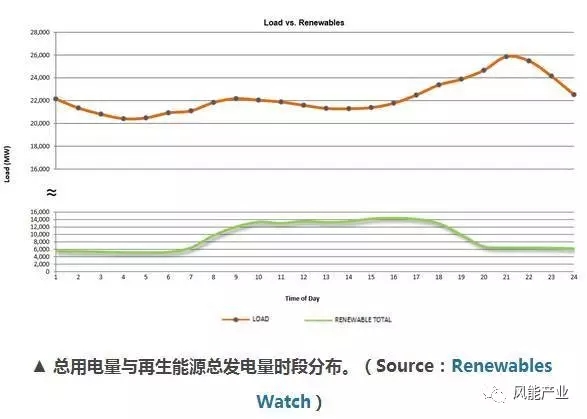 在凌晨時(shí)段,再生能源約可以負(fù)擔(dān)總用電需求的27%,當(dāng)太陽(yáng)出來(lái)后,最高可負(fù)擔(dān)63%,但入夜后發(fā)電量劇降加以用電量驟升,負(fù)擔(dān)比例再度回到23%至27%的水準(zhǔn)。