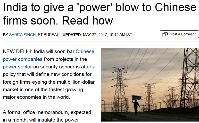 印度官員們聲稱,這種新的以“互惠”為基礎(chǔ)的做法將會(huì)影響到在印度電力輸送部門尋求投資的中國企業(yè)。報(bào)道稱,中國出于安全考慮不允許海外投資涉入其電網(wǎng),但印度允許外商在其電力領(lǐng)域開展直接投資(FDI)。