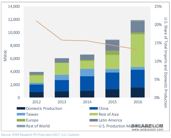但Suniva認(rèn)為,這一申請(qǐng)將會(huì)成功遏制美國(guó)太陽(yáng)能公司裁員、破產(chǎn)的頹勢(shì)。數(shù)據(jù)顯示,目前美國(guó)太陽(yáng)能公司的市場(chǎng)份額在不斷縮減。
