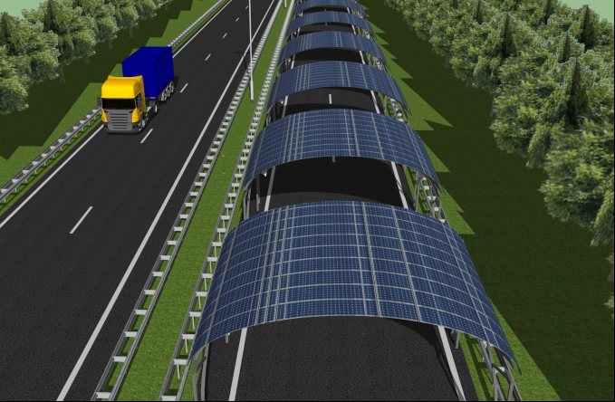 架空式太陽(yáng)能光伏公路充分利用公路路面上層立體空間,在公路行車(chē)路面的上方建設(shè)適當(dāng)高度的太陽(yáng)能光伏發(fā)電廊道,在產(chǎn)生電能的同時(shí)集公路線形誘導(dǎo)、輔助照明、智能監(jiān)控等功能于一體,是新型的公路交通基礎(chǔ)設(shè)施。